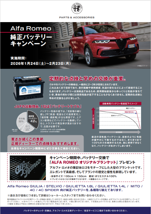 ALFA ROMEO バッテリー交換キャンペーン! 2026.1.24(sat)-2.23(Mon) 〇定...